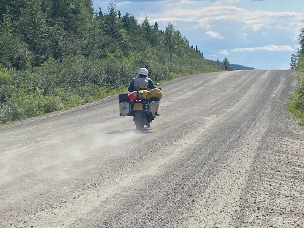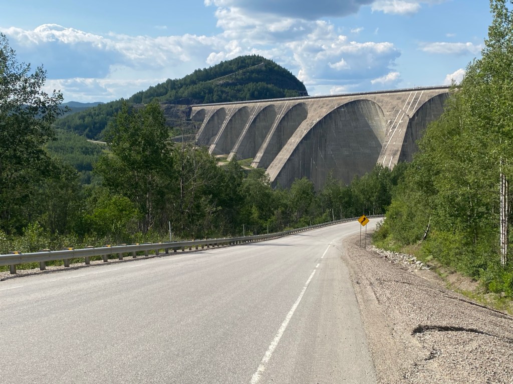 A brilliant day riding south followed, with long sections of gravel roads, and thankfully under blue skies. This is the continuation of the TLH, but in Quebec. After a few hours we get to Manic 5, a huge hydroelectric dam and power station with a name to die for. Riding on, the road becomes glorious, fast sweeping bends over undulating terrain. We stopped to camp near another dam, Manic 2. I later learned that the river descending the valley is called the Manic river. Manics 1, 3 and 4 also exist.